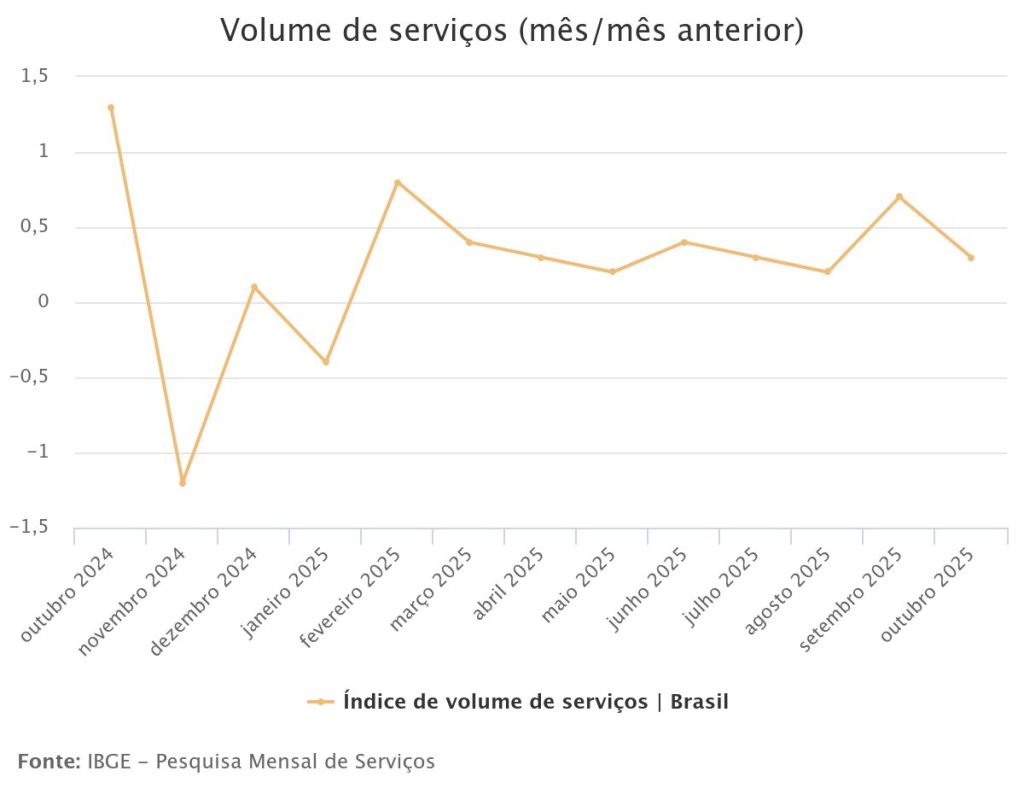 O setor de serviços variou 0,3% em outubro, na comparação com setembro, nono resultado positivo seguido, período em que acumulou alta de 3,7%. Com isso, o volume de serviços está 20,1% acima do nível pré-pandemia (fevereiro de 2020) e renovou o patamar recorde da série histórica. Essa é a maior sequência de resultados positivos desde o período de oito meses compreendido entre fevereiro e setembro de 2022, quando houve crescimento acumulado de 5,6%.
